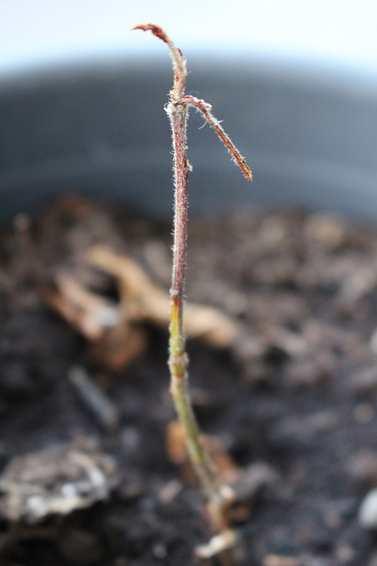 Die Frostwelle hat bewirkt, dass Orangenbäumchen Nr. 2, das die ganze Zeit draußen stand, erfroren ist. Zum Glück hatte ich Orangenbäumchen Nr. 1 in der Wohnung. Was das Apfelbäumchen betrifft, dessen Blätter im Herbst bei Kälteinbruch abgefallen waren, auch da gebe ich die Hoffnung nicht auf. Das Bäumchen ist unten grün und oben rötlich mit Trichome, so feinen Härchen: