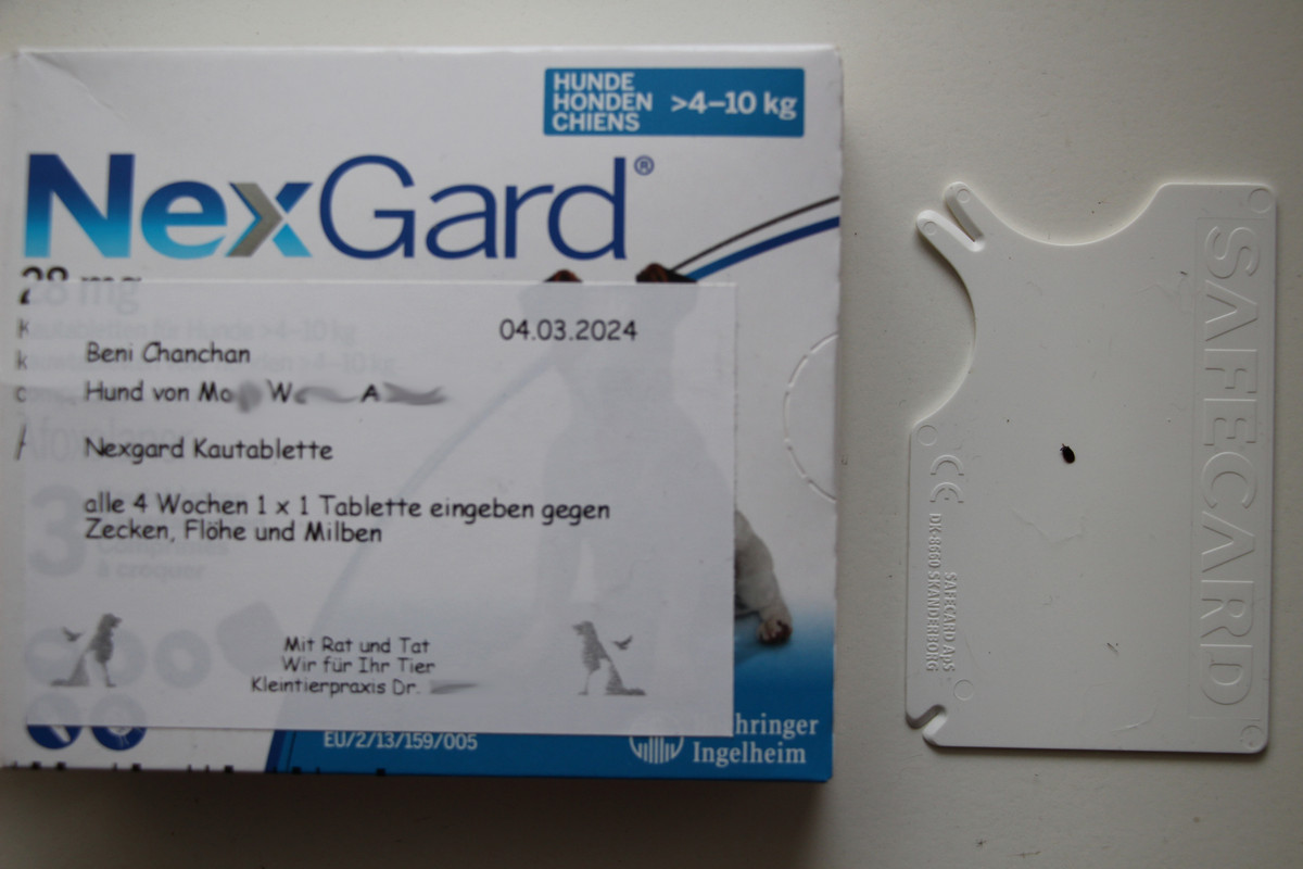 Heute Morgen als ich Chanchan gebürstet habe, habe ich eine Zecke an Chanchans Bauch entdeckt. Später habe ich gesehen, dass die Zecke tot war, und dann ist mir eingefallen, dass Chanchan jetzt monatlich eine Tablette gegen Zecken & Co. nimmt: