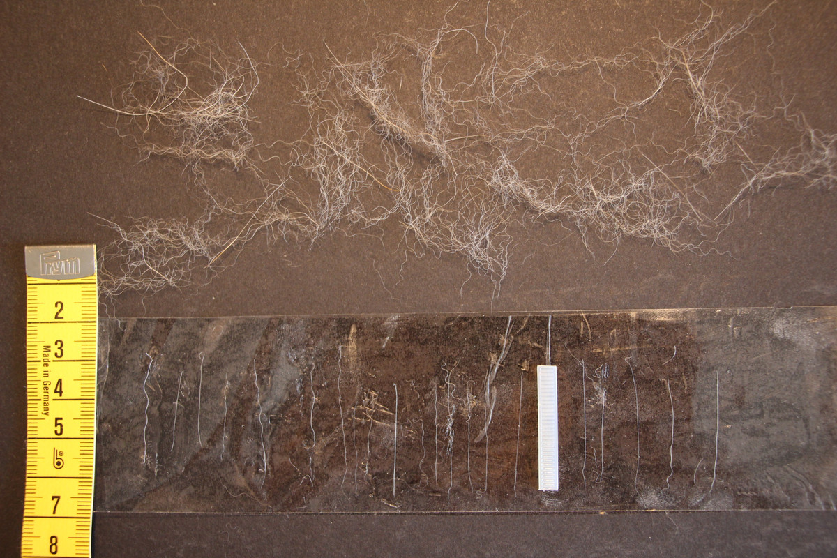 Auf einer Webseite habe ich gesehen, dass das zu spinnende Tierhaar mindestens 3 cm lang sein muss. Ich habe stichprobenartig einige der kürzeren Haare von Chanchan gemessen, und ich hatte das Gefühl, dass die meisten ihrer kürzeren Haare etwa 3 cm lang sind:
