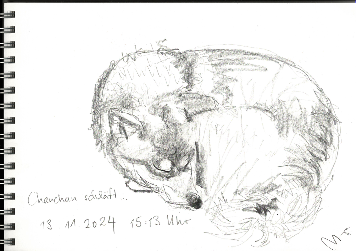 Vorhin habe ich nach sehr Langem wieder gezeichnet. Chanchan schlief nur 10 Minuten lang ruhig, danach ist sie aufgestanden und hat an der Zeichnung und an den Bleistiften geschnuppert.
