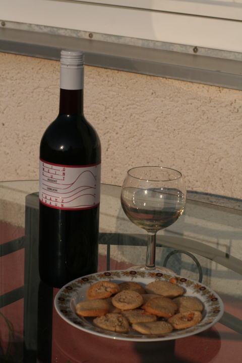 Vielleicht mal ein bisschen relaxen. Mit Rotwein, Regent lieblich (2015) vom Bio-Weingut Franz Braun aus Ranschbach und selbstgemachten Englischen Butterplätzchen…