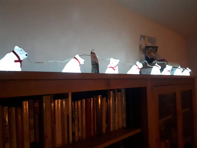 Die Tannenzweige habe ich in eine Vase getan, damit sie nicht zu früh austrocknen. Sonst haben wir nicht so viele Weihnachtsschmuck, einige Sterne aus Papier und Holz, und einige Lichterketten. Zuletzt haben wir uns diese Eisbären-Lichterkette geholt