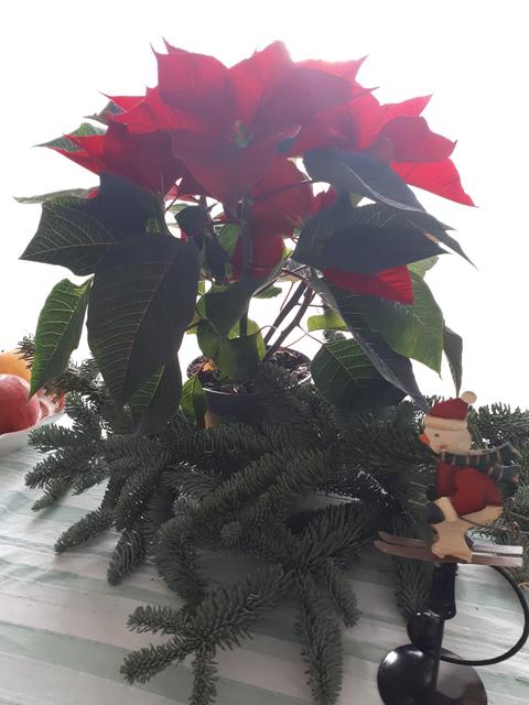 Beim Einkaufen habe ich alles bekommen, was ich in meiner Einkaufsliste hatte. Jetzt schmücken ein Topf Weihnachtsstern und einige Tannenzweige unseren Esstisch: