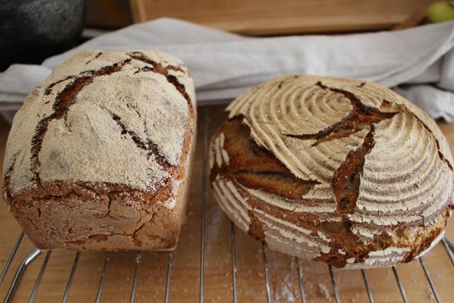 Die 2 Brote reichen nicht aus für eine ganze Woche. Eigentlich brauchen wir noch ein zusätzliches. Nächstes Wochenende werde ich schauen, wie ich die Teigmenge erhöhen kann. Oder ich backe mitten in der Woche nochmal, aber das ist zeitlich ungeschickt. Am besten 3 Laibe am Wochenende backen und 2 einfrieren.