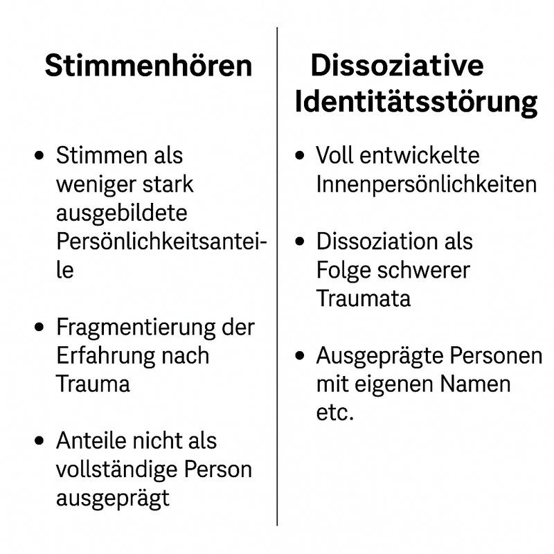 - Damit erfüllen die Stimmen ähnliche Funktionen wie die dissoziierten Persönlichkeiten bei DIS, nur weniger stark differenziert.
