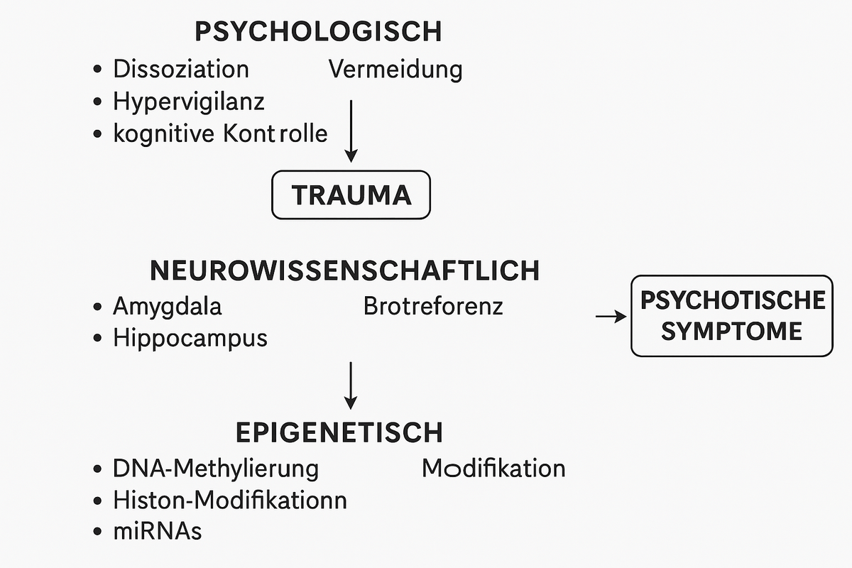 👉 Ein Teufelskreis, in dem Trauma → epigenetische Stress-Sensibilisierung → veränderte Hirnnetzwerke → psychologische Schutzmechanismen → manchmal psychotische Symptome.✨ Fazit: